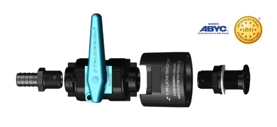 Kompletny zestaw przelotowy TRUDESIGN z tworzywa sztucznego do montażu przez kadłub jachtu lub łodzi motorowej. W skład wchodzi przelot kadłubowy, kołnierz nośny, zawór kulowy oraz proste przyłącze węża. Dostępny w kilku rozmiarach gwintu i średnicach przyłącza.